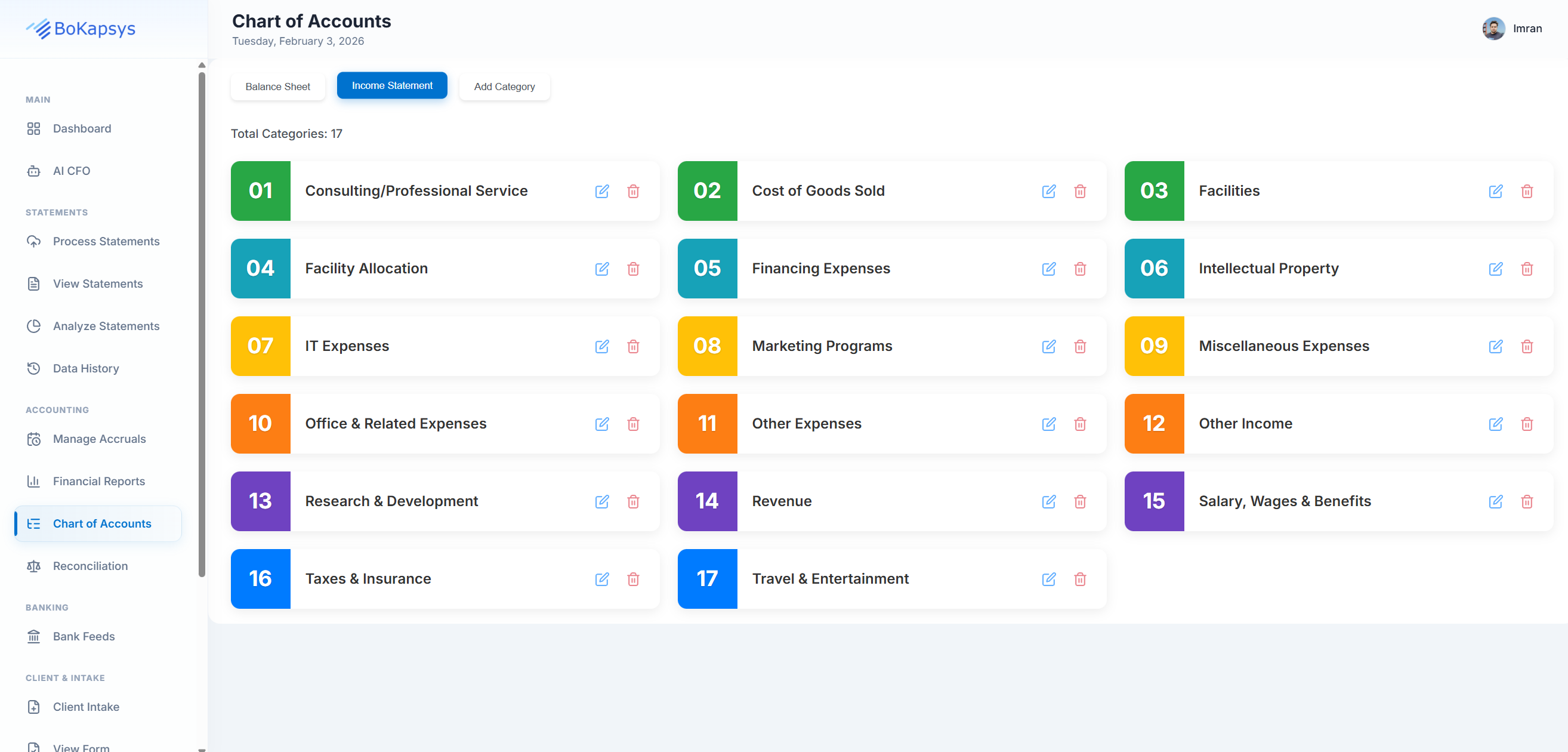 Every transaction is automatically classified using GPT-4 embeddings and a hierarchical Chart of Accounts taxonomy. The system maps each entry to the correct statement type, category, subcategory, and account code. It learns your patterns and saves categorization rules - so similar transactions are classified instantly next time.